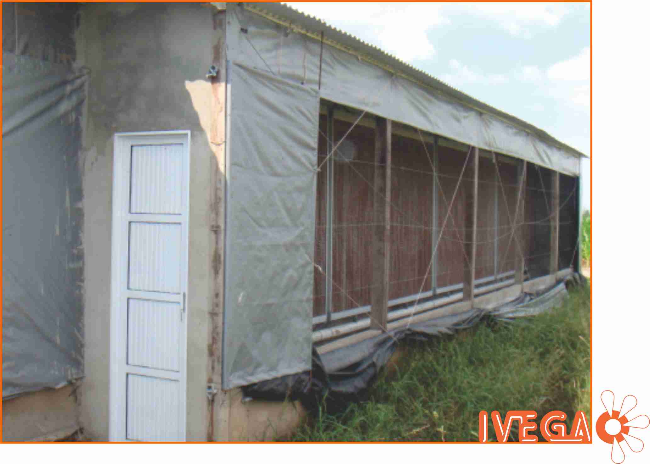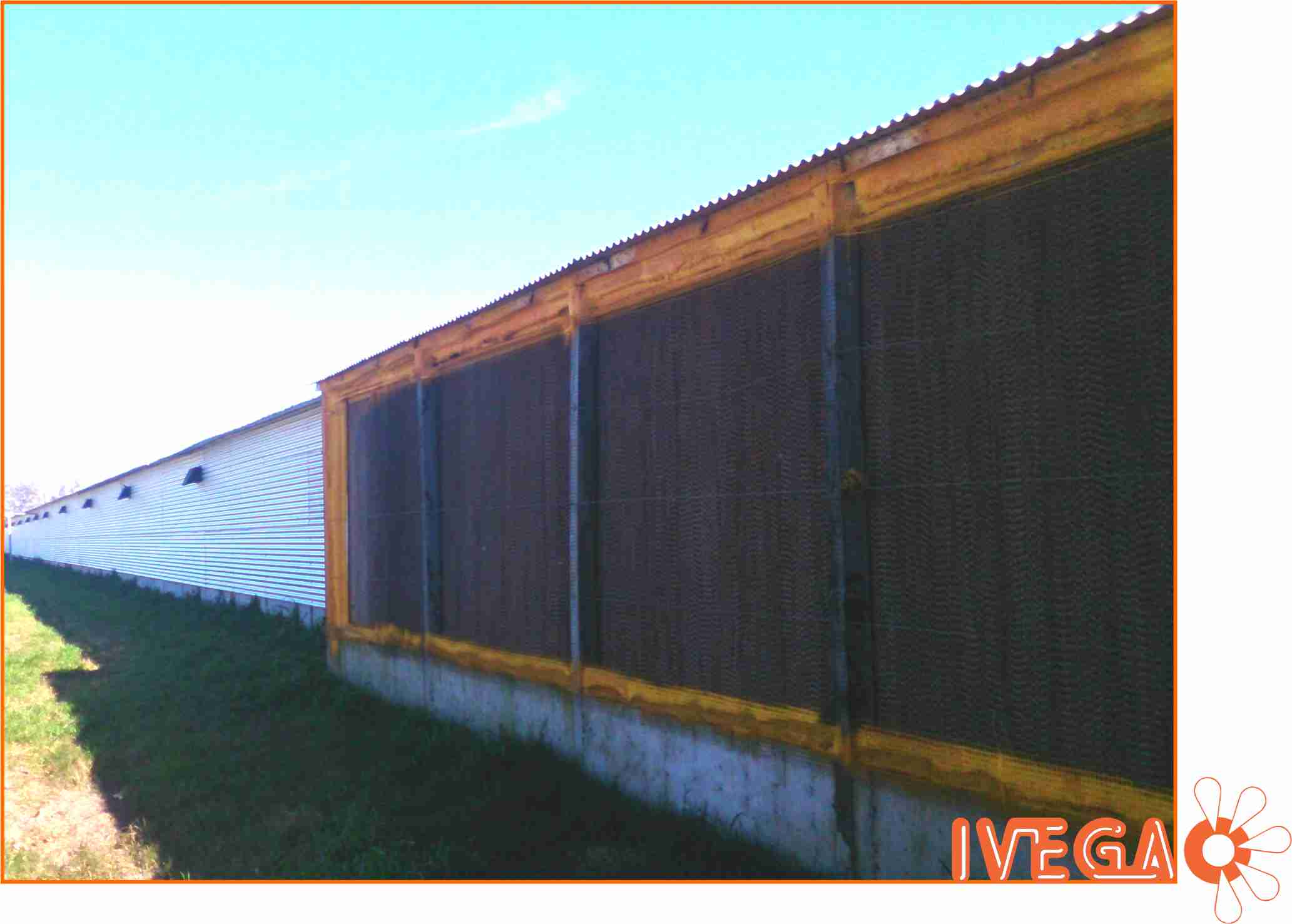 En cuanto al sistema de evaporación por paneles evaporativos, cabe destacar que es un sistema muy eficaz, siempre y cuando el galpón esté bien aislado. Este sistema va combinado con el sistema de ventilación tipo túnel con extractores. Los paneles van colocados en el extremo en donde entra el aire al galpón. El sistema se basa en el fundamento de que al evaporarse el agua que entra con el aire, esta le quita calor reduciéndose la temperatura ambiente.