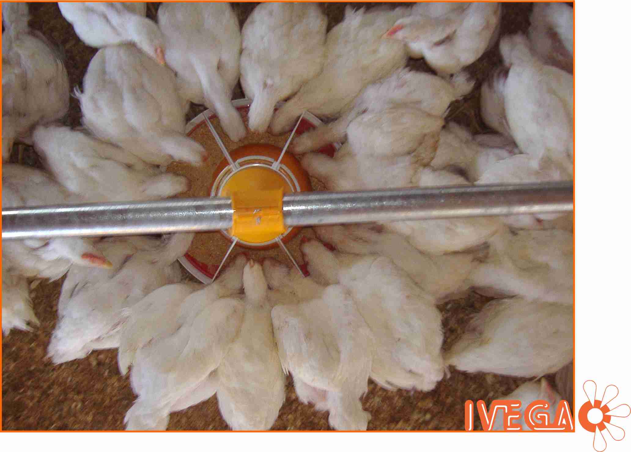Nuestro Sistema automático de alimentación para aves ahorra trabajo y alimento. Permite alternar la crianza de pollos, parrilleros, pavos, patos, codornices, perdices y otras aves, a la vez que garantiza un excelente arranque de cualquier tipo de ave. El plato comedero IVEGA tiene 2 niveles automáticos de suministro de alimento, para pollitos BB al apoyar el plato en el piso, con llenada del plato los 360° y para pollos adultos al levantar la línea. Además dispone de un aro con 5 regulaciones de nivel para adecuarlo a cada tipo de alimento y de ave.