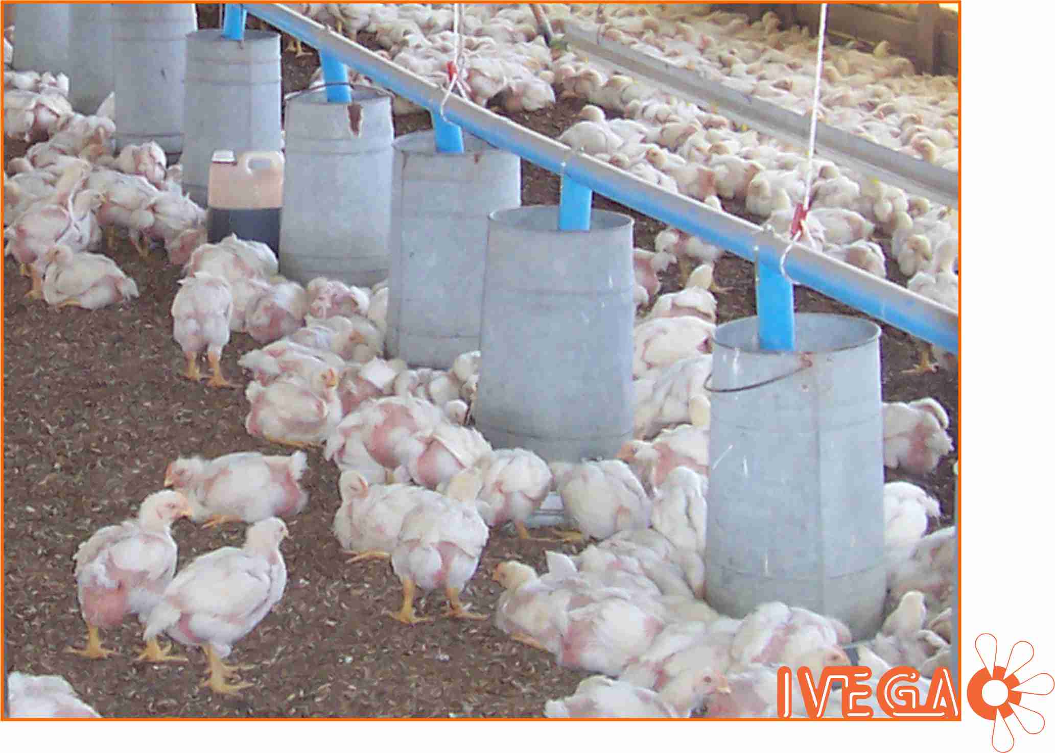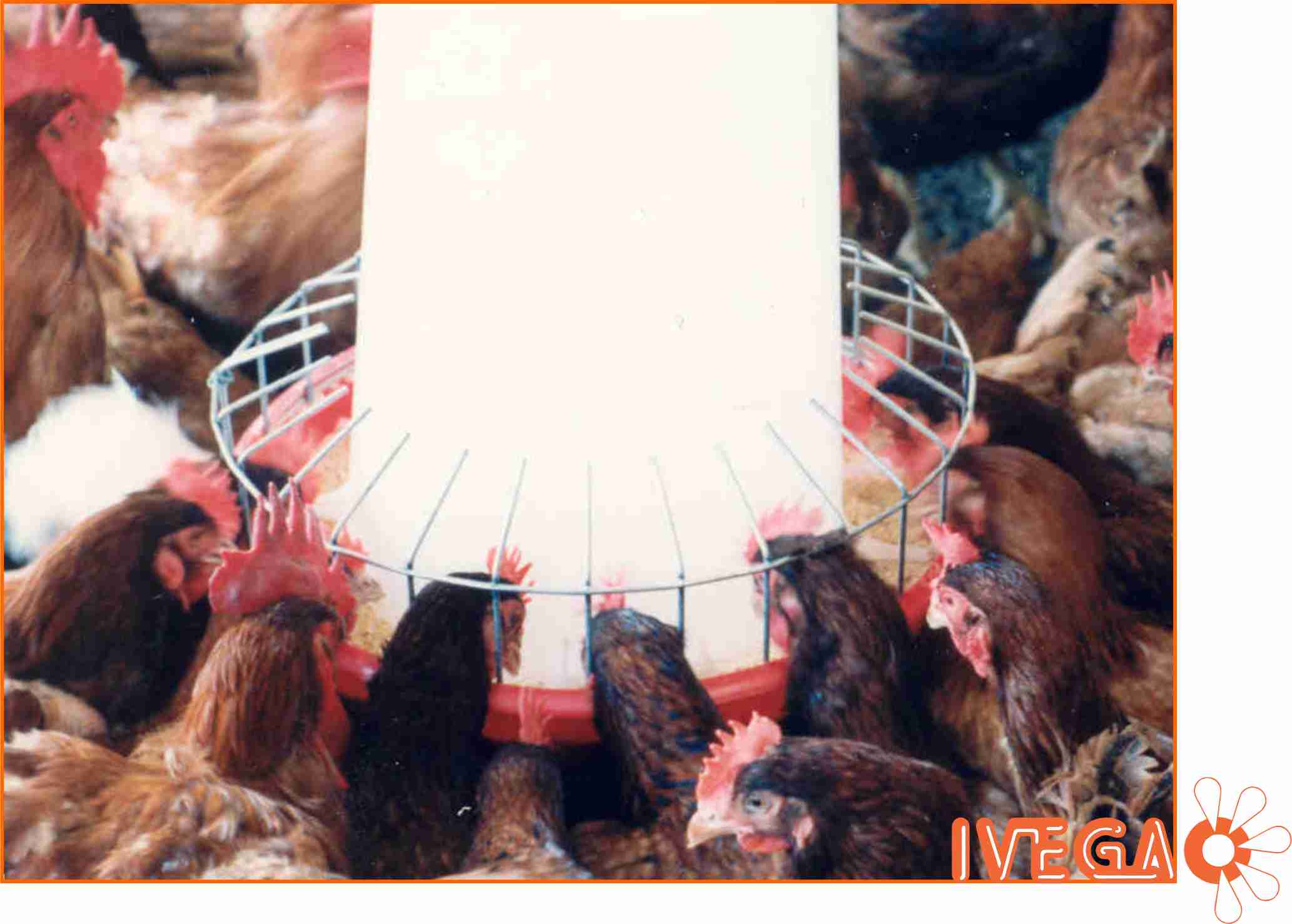 Sistema de alimentación por tolva plástica IVEGA de 18 kg de capacidad, con 12 aletas en la base del cono que hace que las aves no seleccionen el alimento. El plato cuenta con una pestaña anti-desperdicio que minimiza que las aves tiren el alimento fuera del plato.