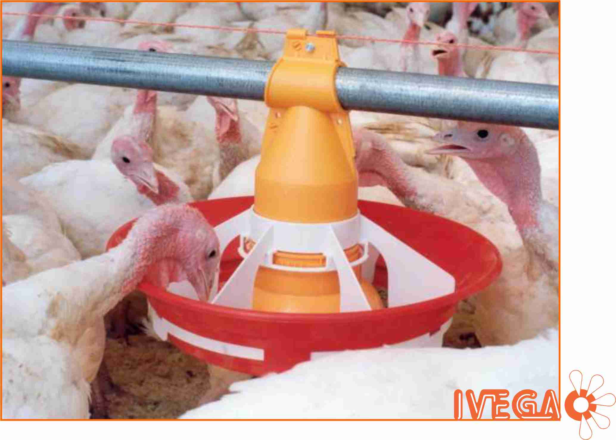 Para pavos, patos y aves grandes, a partir de 6 ó 7 semanas, el plato IVEGA va equipado con un aro anti-desperdicio adicional, de fácil montaje que aumenta la distancia del alimento y recoge los sobrantes devolviéndolos al plato.