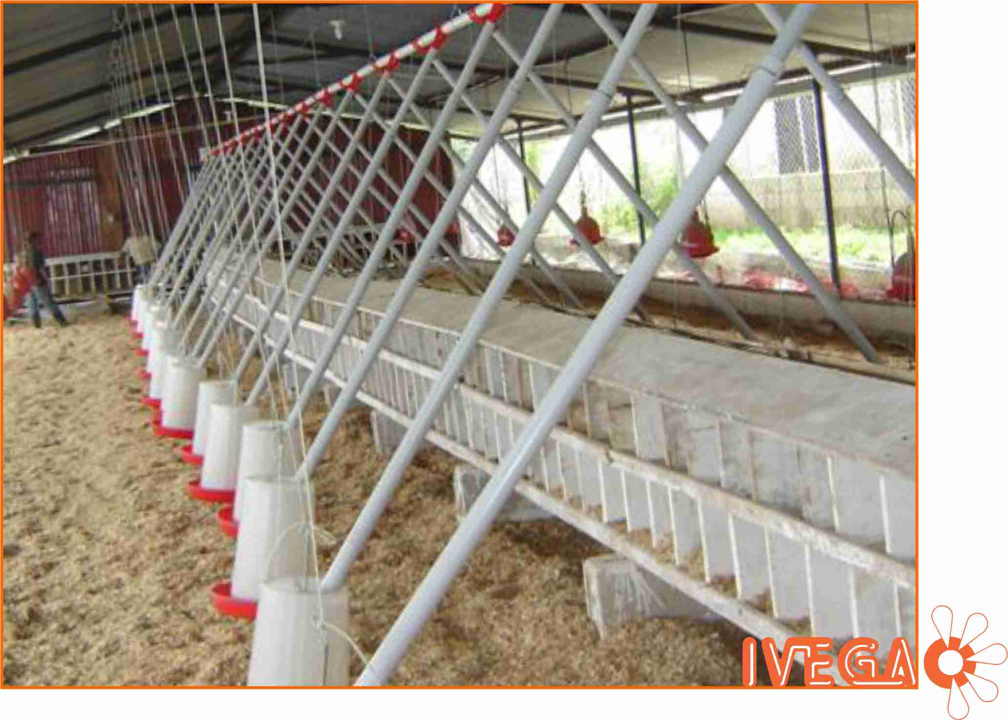Sistema de alimentación por tolva plástica IVEGA de 18 kg de capacidad, con 12 aletas en la base del cono que hace que las aves no seleccionen el alimento. El plato cuenta con una pestaña anti-desperdicio que minimiza que las aves tiren el alimento fuera del plato.